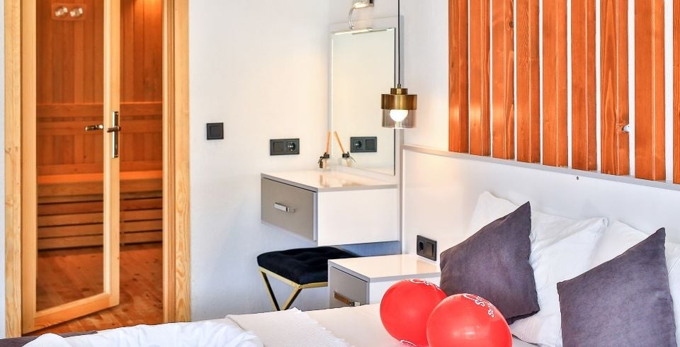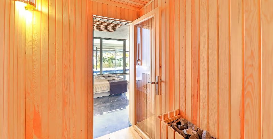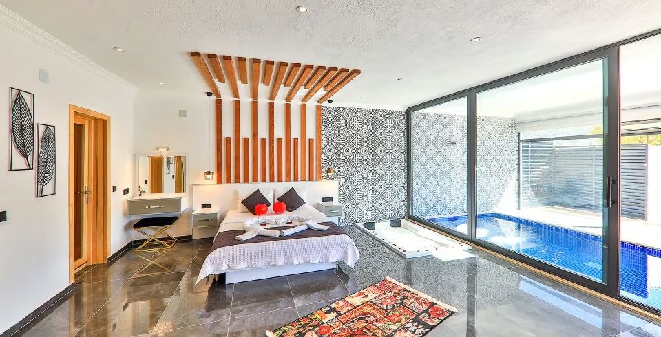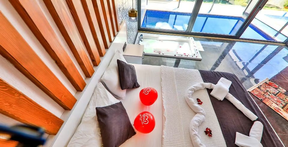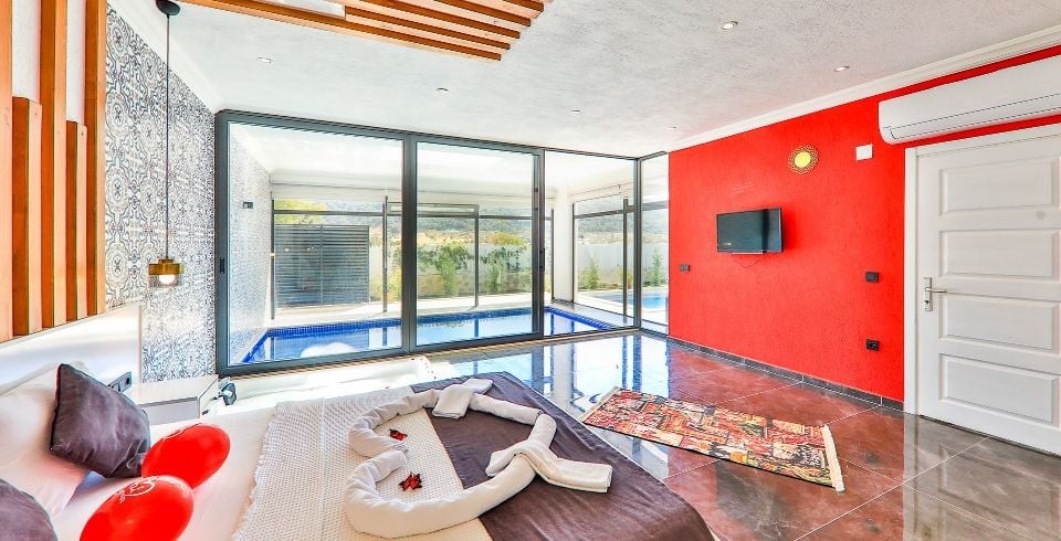 Villada bir adet geniş yatak odası, jakuzi, sauna, hamam, ısıtmalı kapalı havuz ve özel yüzme havuzu bulunmaktadır. Bu donanımlar sayesinde, yılın her mevsiminde keyifli bir tatil yapma imkânı sunar. Villanın modern iç mimarisi, zarif mobilyalarla tamamlanmış olup, romantik bir atmosfer oluşturacak şekilde özenle dekore edilmiştir.