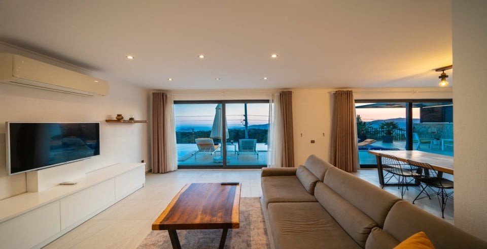 İç mekânında modern detaylar ön plandadır. Ferah salonunda konforlu oturma grubu, televizyon, klima ve havuz terasına doğrudan çıkış bulunur. Amerikan mutfak kısmında buzdolabı, ankastre fırın, mikrodalga, bulaşık makinesi, çamaşır makinesi, kettle, ocak, yemek takımı ve tüm mutfak gereçleri yer alır. Villanın her alanı, misafirlerine ev konforunda bir tatil sunacak şekilde özenle hazırlanmıştır.