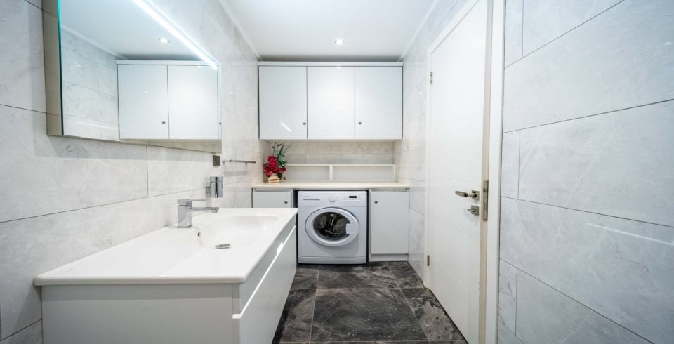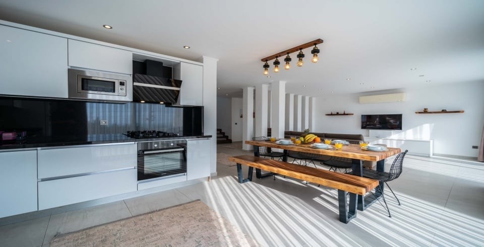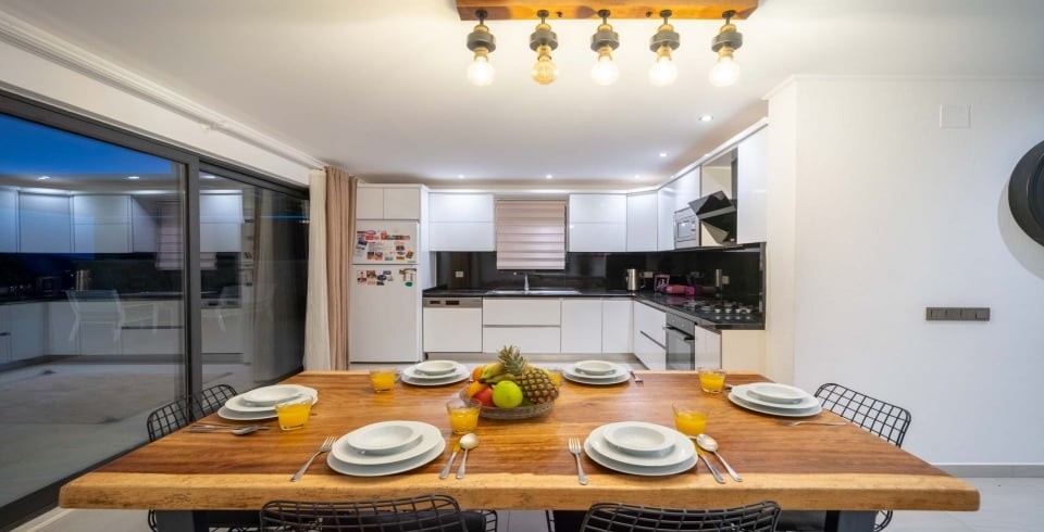 Mutfak: Villamızın geniş Amerikan mutfağı ile sizlere kendi evinizin mutfağı gibi hissettirecek. Ayrıca mutfakta klima, bulaşık makinası, buzdolabı, çamaşır makinası, mikrodalga fırın, su ısıtıcısı, fırın, 4`lü ocak seti ve 6 kişilik geniş yemek masası ile tava tencere vb. mutfak araç gereçlerini kullanma fırsatını sizlere sunuyoruz.