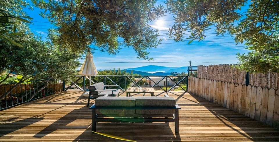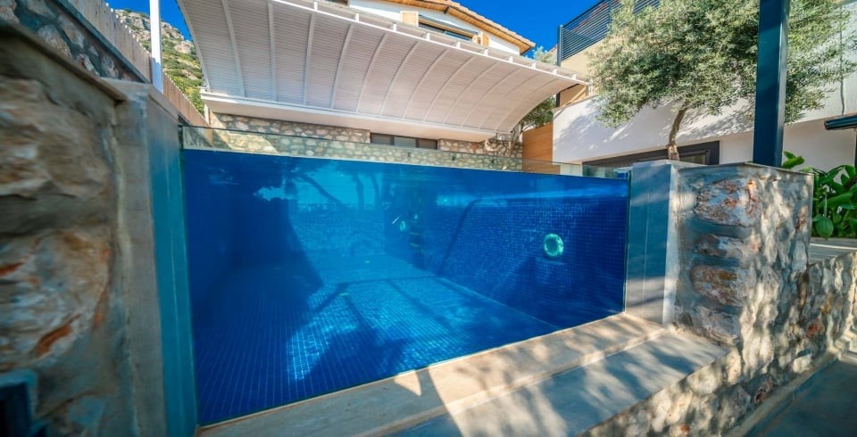 Villanın dış alanı tamamen korunaklı özel yüzme havuzu ile çevrilidir. Havuzun ön cephesinde yer alan cam detay, villa mimarisine modern bir dokunuş kazandırır. Gözlerden uzak havuz terasında şezlonglar, oturma grubu ve barbekü alanı bulunur; böylece gün boyu doğanın keyfini çıkarabilir, akşamları ise yıldızlar eşliğinde huzurlu saatler geçirebilirsiniz.