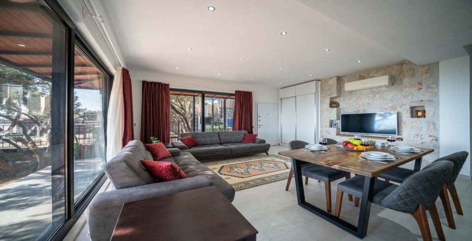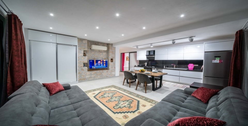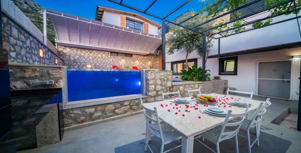 Kalkan’ın sessiz ve huzurlu bölgelerinden biri olan Kördere’de konumlanan Villa Therapy Aqua, doğanın içinde konforlu bir konaklama deneyimi sunan özel bir tatil villasıdır. Modern mimarisi ve zarif tasarımıyla öne çıkan villa, 2 yatak odasıyla 4 kişilik konaklama kapasitesine sahiptir. Özellikle balayı çiftleri ve muhafazakâr aileler için tasarlanmış olan bu villa, hem doğayla iç içe huzurlu bir atmosfer hem de şehir merkezine yakın bir konum avantajı sunar.