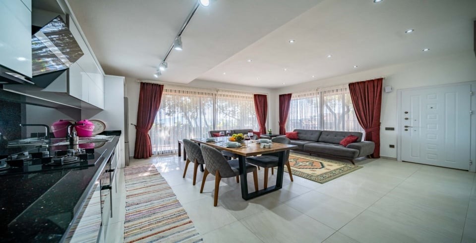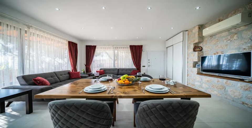 Villanın iç mekânı ferah, modern ve konforlu detaylarla donatılmıştır. Geniş oturma alanında televizyon, klima ve rahat bir oturma grubu bulunurken, tam donanımlı Amerikan mutfakta buzdolabı, ankastre fırın, mikrodalga, çamaşır ve bulaşık makinesi gibi ihtiyaç duyabileceğiniz tüm ekipmanlar yer almaktadır. Aydınlık salon kısmı havuz terasına açılarak doğa manzarasının keyfini içeri taşır.