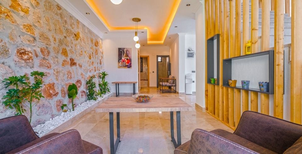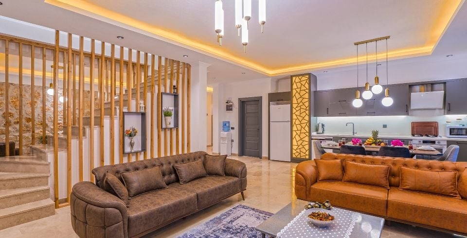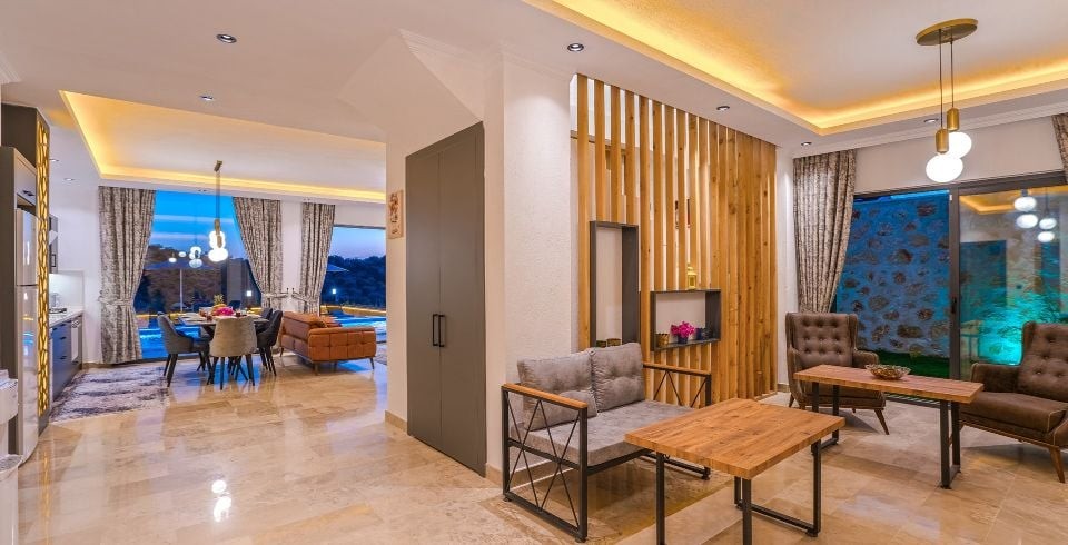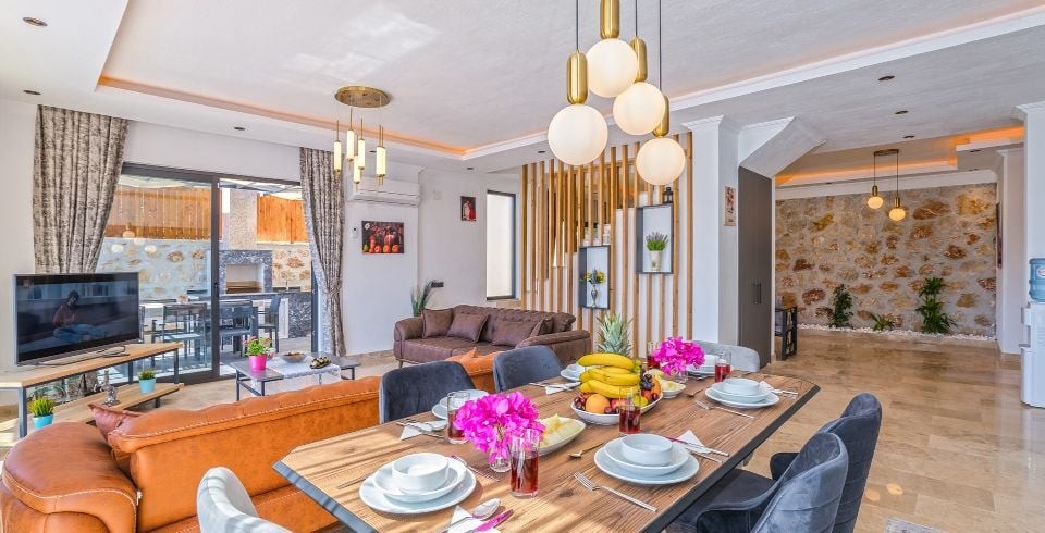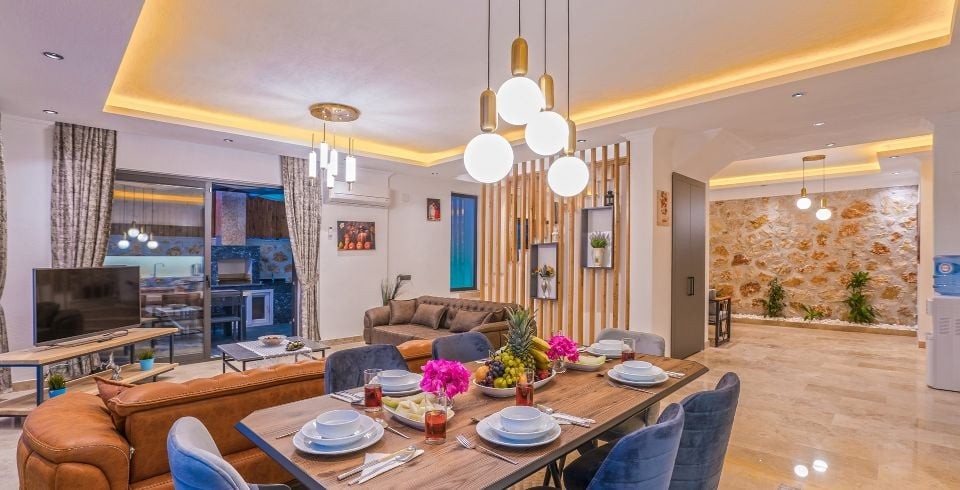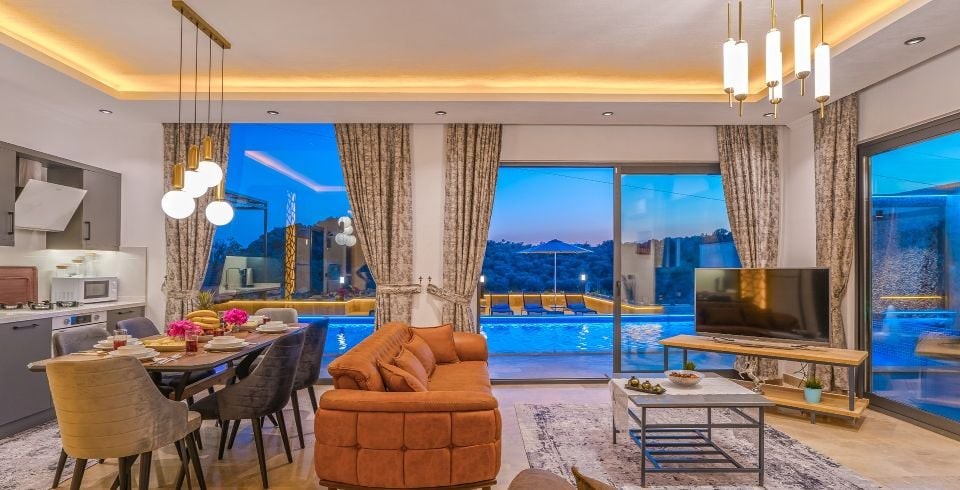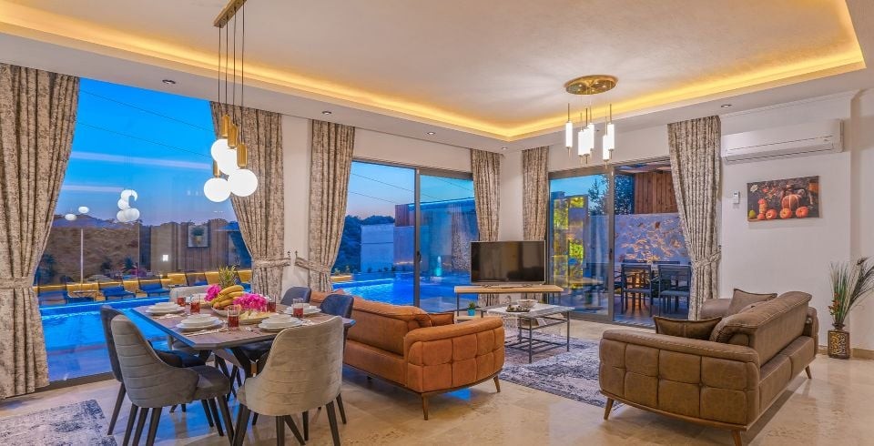 Salon : Salon içerisinde oturma grubu, TV, klima, sehpa bulunmaktadır. Havuz terasına çıkış yapılabilmektedir.