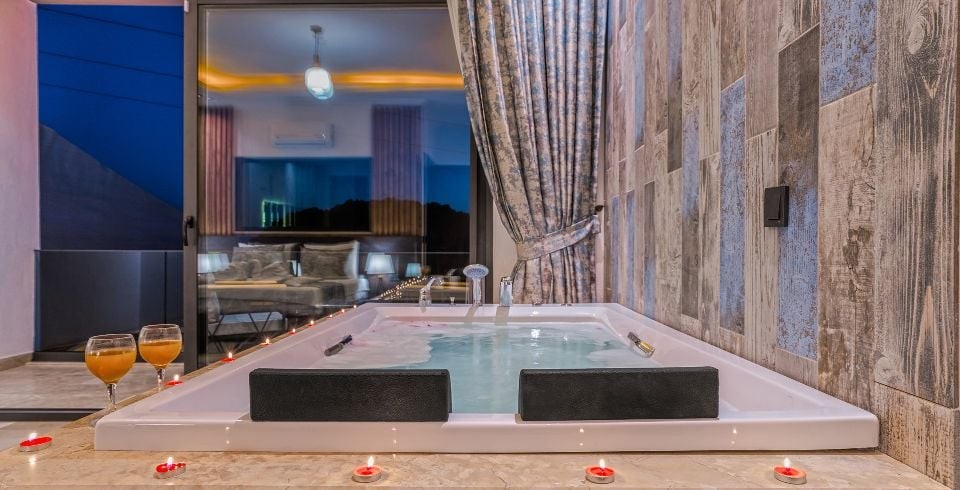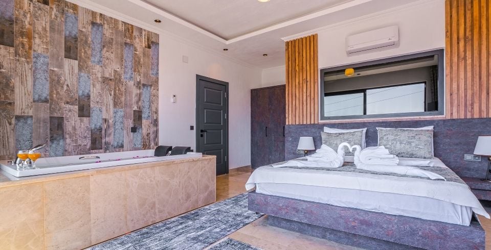 1. Yatak Odası : 1 adet çift kişilik yatak, klima, komodin, elbise dolabı, jakuzili havuz, banyo ve tuvalet bulunmaktadır.