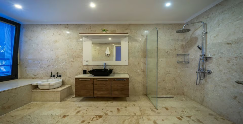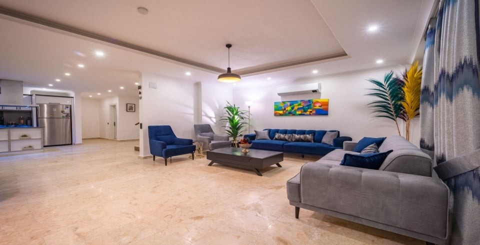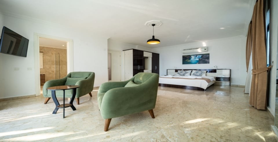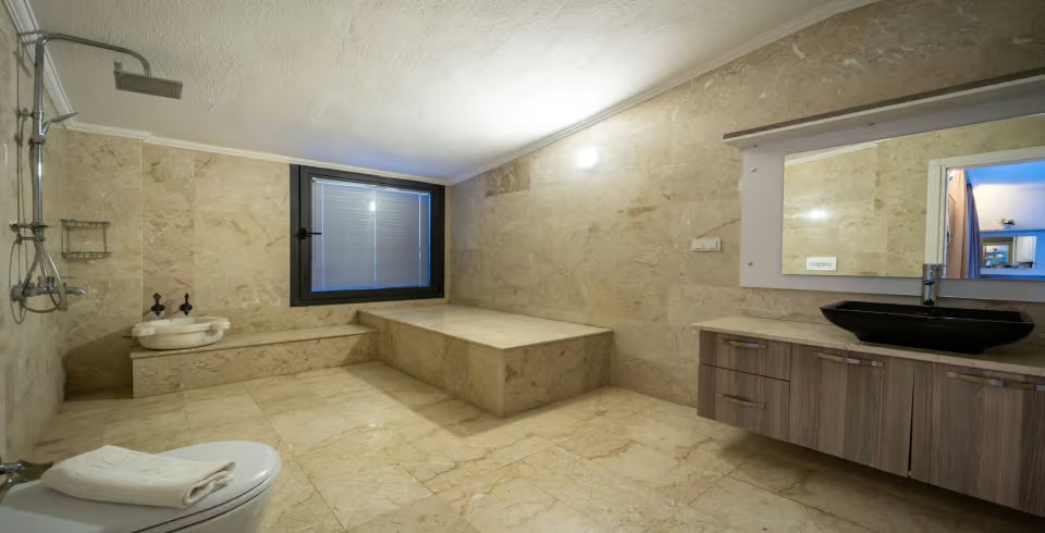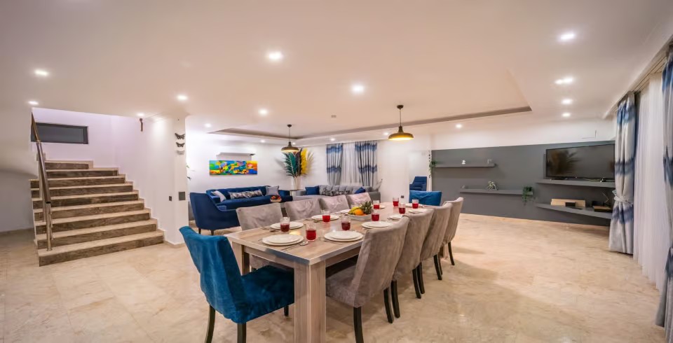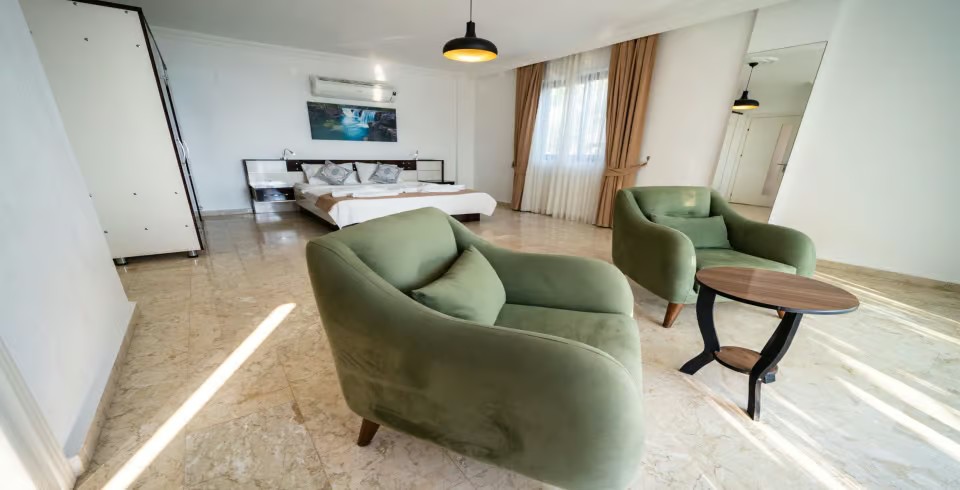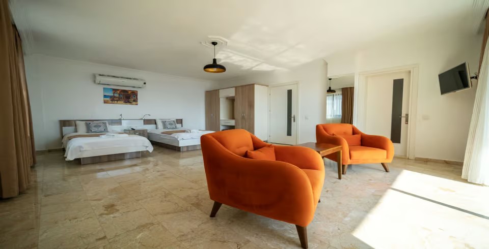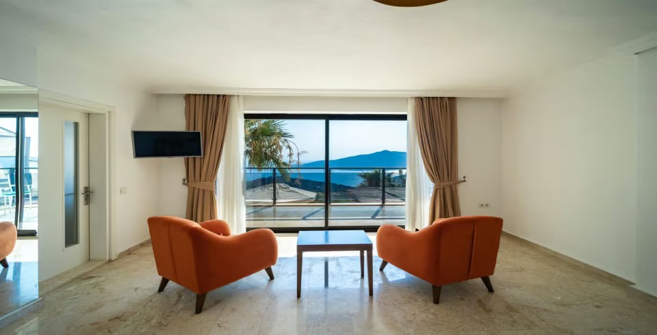 Salon : Salon içerisinde oturma grubu, TV, klima, sehpa bulunmaktadır. Havuz terasına çıkış yapılabilmektedir.