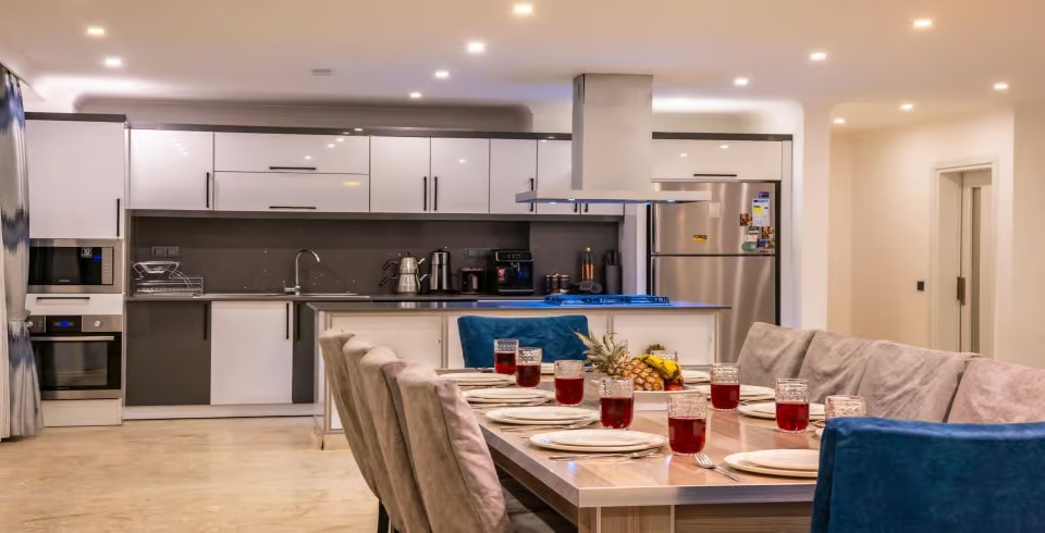 Mutfak : Modern Amerikan mutfak içerisinde yemek masası, buzdolabı, bulaşık makinası, fırın, ocak, mikrodalga fırın, yemek takımları, çatal ve bıçak takımları, tencere ve tava takımları, bardaklar bulunmaktadır.