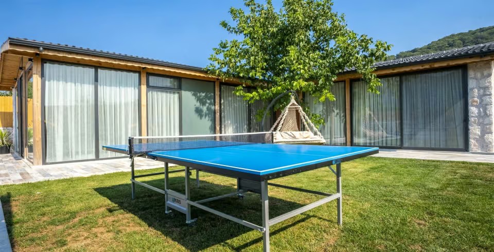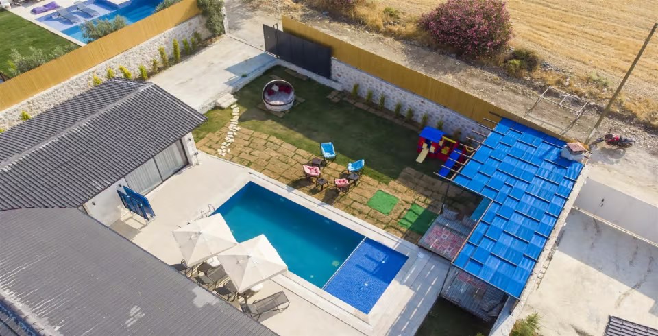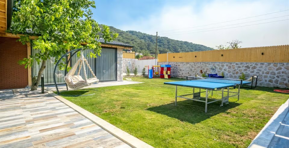 Havuz ve Bahçe : Villamızın bahçesi oldukça geniştir ve çocuklu ailelerimiz için oldukça uygundur. İçerisinde çocuklar için kaydırak, salıncak bulunmaktadır. Yalnızca çocukların değil ebeveynlerinin oynamaktan keyif alacağı masa tenisi, langırt ve bilardo masası bulunmaktadır. Villamız korunaklı olduğundan dışarıdan kesinlikle görünmemektedir. 2 metre sığ özel yüzme havuzunun içinde şezlong bulunan bahçemizde ekstra şezlonglar, şemsiye, yemek masası, salıncak bulunmaktadır.