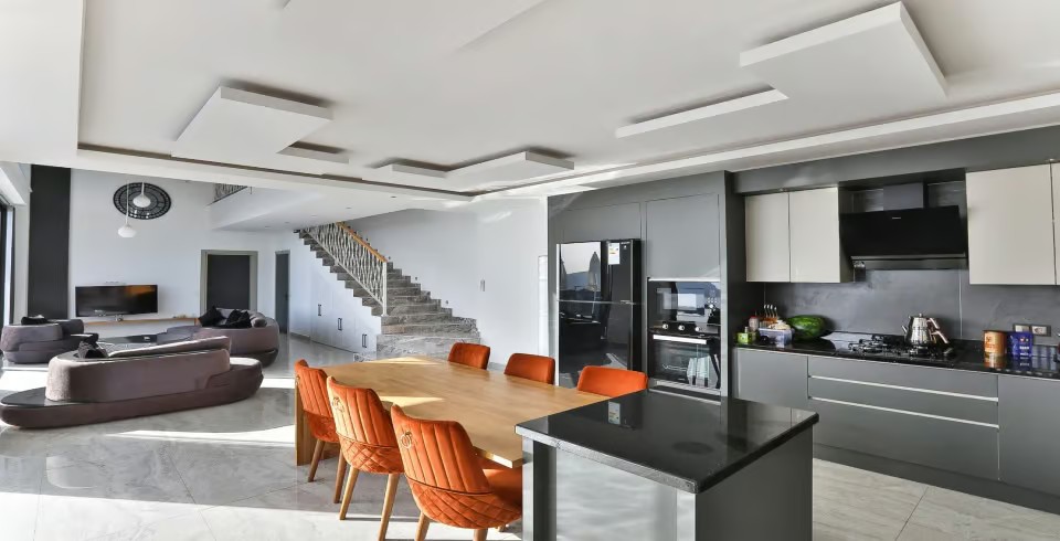 Mutfak : Modern Amerikan mutfak içerisinde buzdolabı, bulaşık makinası, fırın, ocak, mikrodalga fırın, yemek masası, yemek masası, yemek takımları, çatal ve bıçak takımları, tencere ve tava takımları, bardaklar bulunmaktadır.