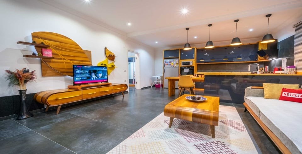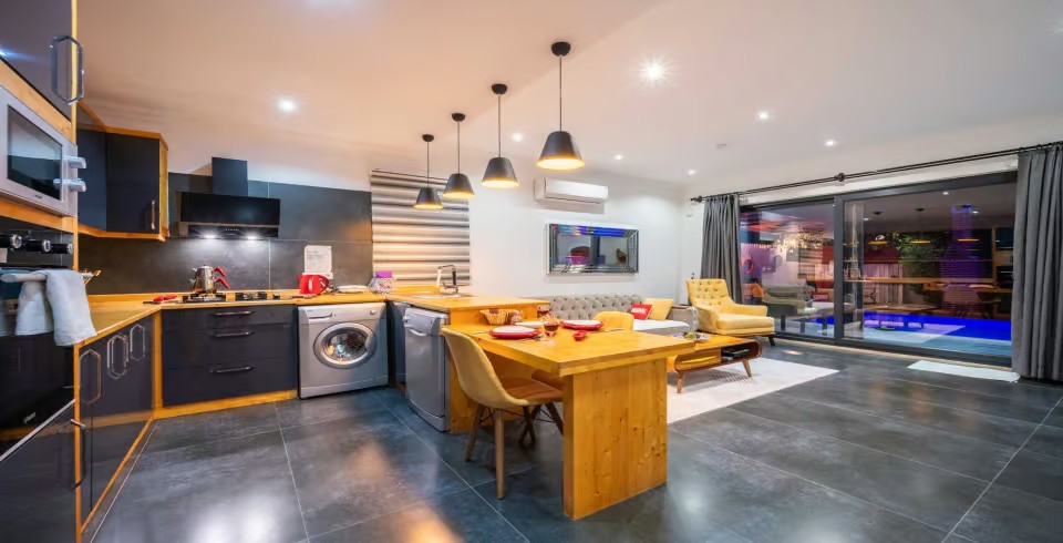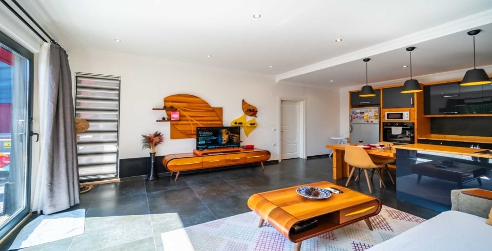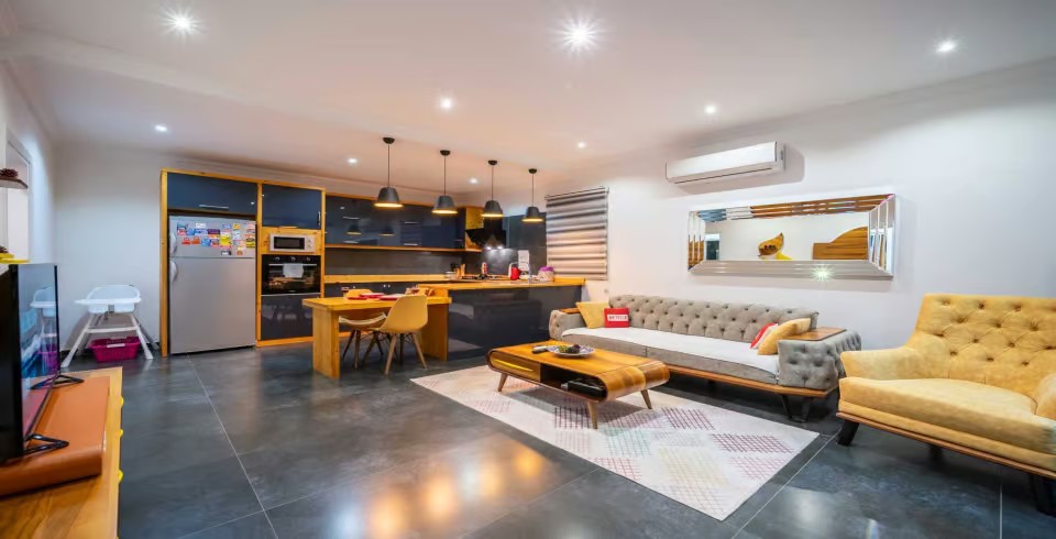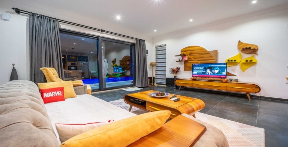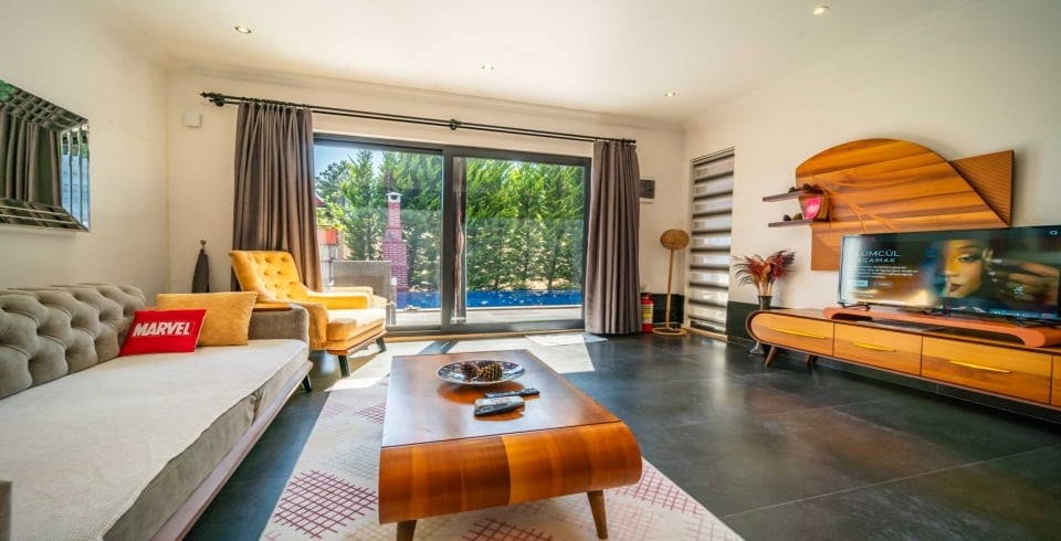 Salon: Konforlu oturma grubu, TV, uydu alıcı, ütü ve ütü masası, 8 kişilik yemek masası bulunmaktadır. Salondan havuz kenarına çıkış bulunmaktadır ve salon havuz katındadır.