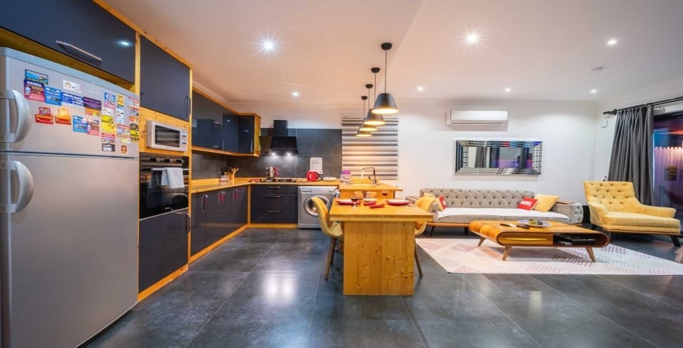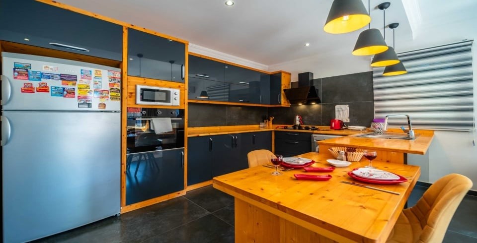Mutfak: Mutfakta ankastre fırın, bulaşık makinası, tencere ve takımı, buzdolabı, kaşık ve çatal seti, çamaşır makinası, 4’lü ocak, elektrikli su ısıtıcı kettle, yemek takımı, tencere ve tava takımı ve bardaklar yer almaktadır. Mutfak havuz katındadır.