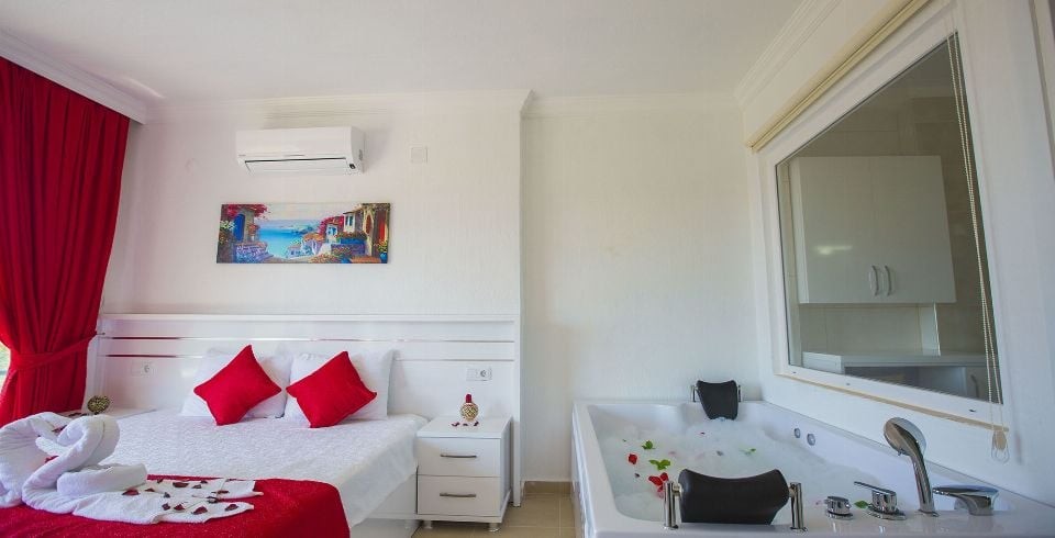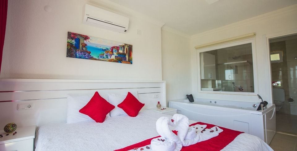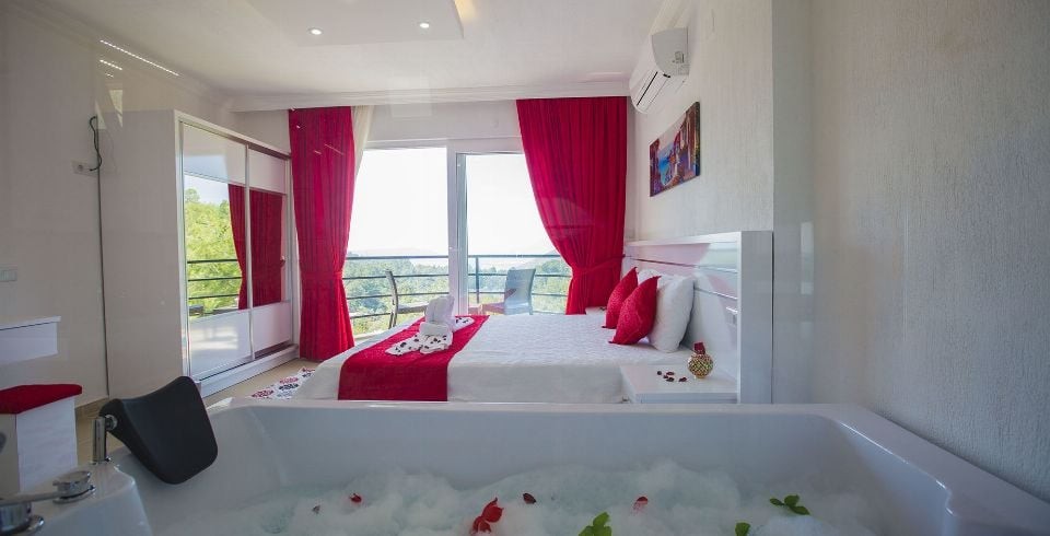 1. Yatak Odası : Çift kişilik süit yatak, klima, komodin, makyaj masası, elbise dolabı, balkon, banyo ve lavabo bulunmaktadır.