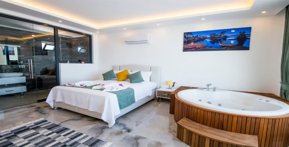 1. Yatak Odası : Çift kişilik yatak, komodin, jakuzi  makyaj masası, elbise dolabı, klima,  banyo ve lavabo tuvalet  bulunmaktadır.