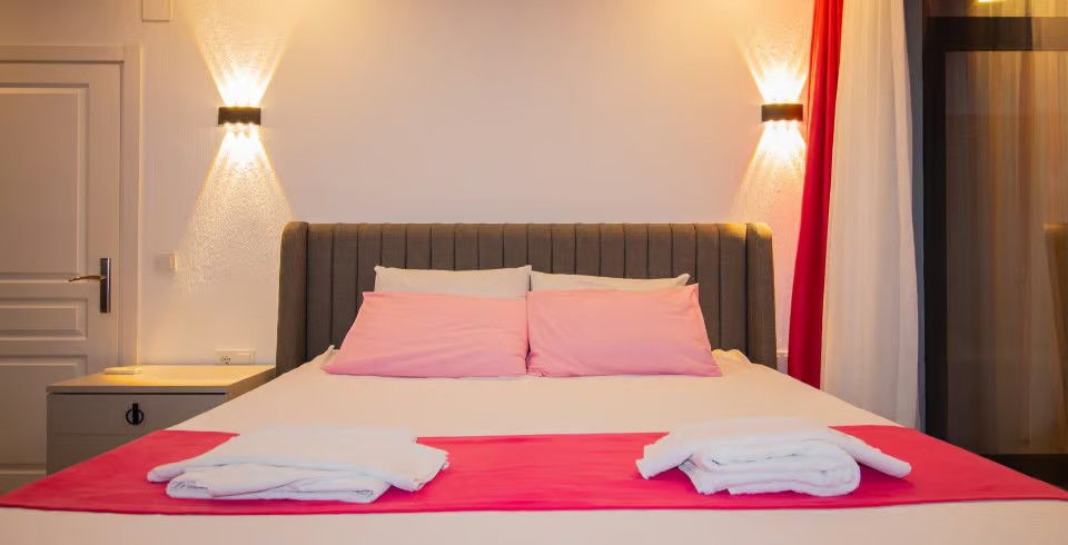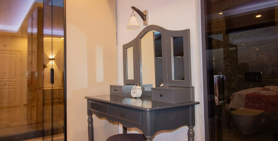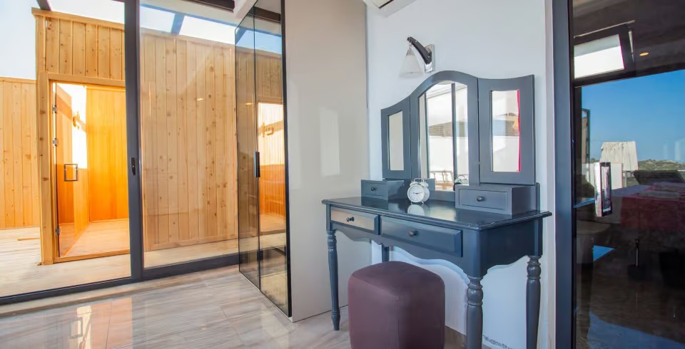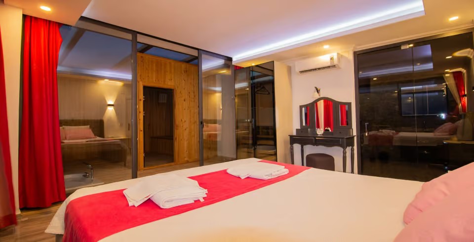 1. Yatak Odası : 1 adet çift kişilik yatak, klima, komodin, makyaj masası, elbise dolabı, banyo ve lavabo bulunmaktadır.