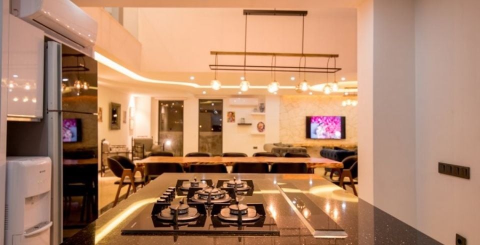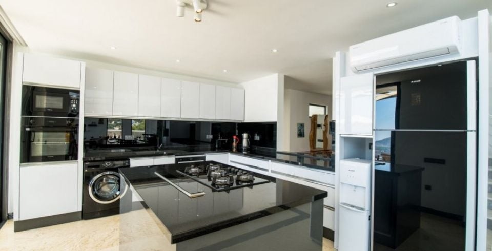 Mutfak: Modern dizayn edilmiş Amerikan mutfak ve dolapları, buzdolabı, çamaşır makinesi, bulaşık makinesi, su sebili, mikro dalga fırın, çaycı, 4'lü ankastre ocak, elektrikli su ısıtıcısı, elektrikli süpürge, 10 kişilik yemek takımı, tava ve tencere takımı  bulunmaktadır.