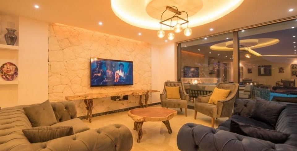 Salon: Geniş ve ferah havuz başına  açılan salon, TV (LCD), uydu, DVD, internet, oturma grubu, 10 kişilik yemek masası, klima, WC bulunmaktadır.