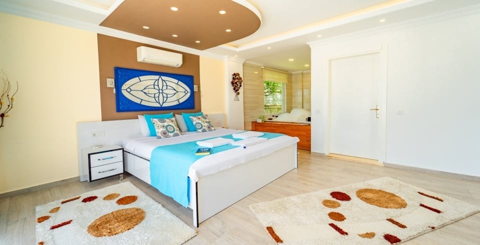 1. Yatak Odası : Çift kişilik süit yatak, klima, komodin, elbise dolabı, jakuzi, balkon, banyo ve lavabo bulunmaktadır.