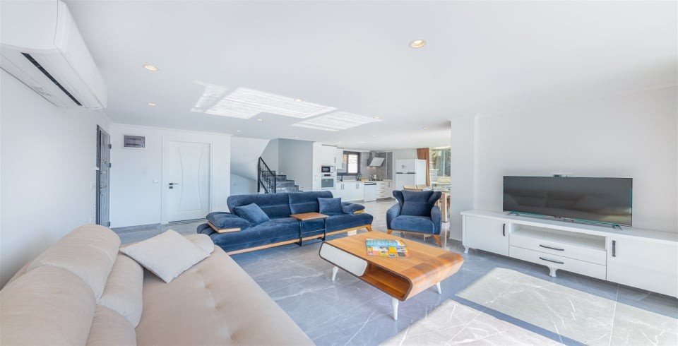 Salon : Salon içerisinde oturma grubu, TV, klima, sehpa bulunmaktadır. Havuz terasına çıkış yapılabilmektedir.