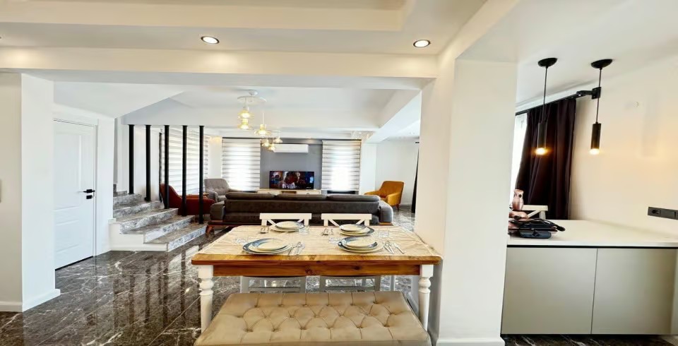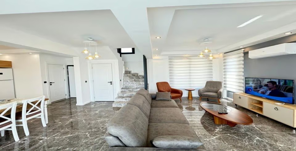 Salon: Özenle döşenmiş açık mutfaklı salon, modern koltuklar, yemek masası, TV, klima ve WC bulunmaktadır.