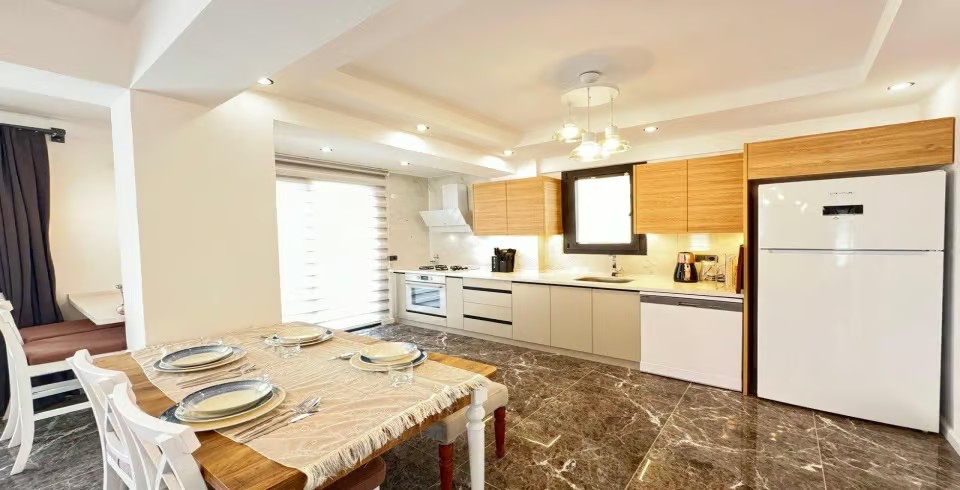 Mutfak: Açık planlı mutfak, 6 kişi ve daha fazla kişiye yetecek kadar mutfak malzemeleri, bulaşık makinesi, fırın, ocak, buzdolabı, mikrodalga fırın, çaydanlık ve kettle, tost makinesi, ekmek kızartma makinesi, mutfak robotu bulunmaktadır.