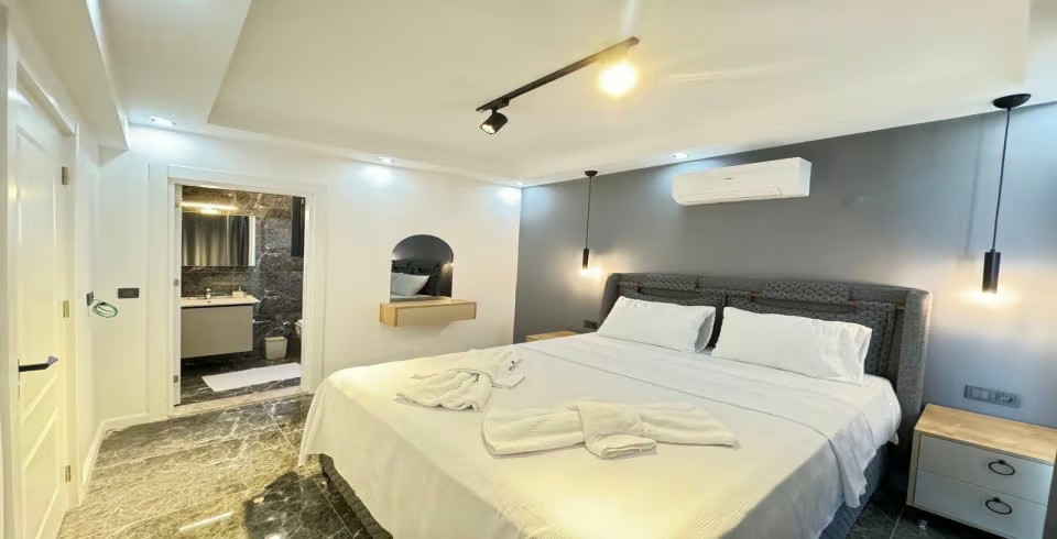 1. Yatak odası: Çift kişilik yatak, jakuzi, sauna, ebeveyn banyosu, klima ve elbise dolabı bulunmaktadır.