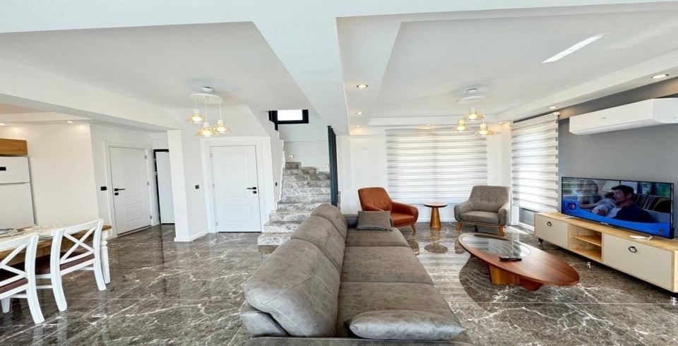 Salon:  Özenle döşenmiş açık mutfaklı salon, modern koltuklar, yemek masası, TV, klima ve WC bulunmaktadır.