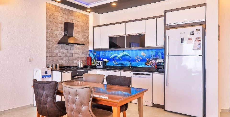 Mutfak : Modern Amerikan mutfak içerisinde buzdolabı, bulaşık makinası, fırın, ocak, mikrodalga fırın, tost makinası, yemek masası, yemek takımları, çatal ve bıçak takımları, tencere ve tava takımları, bardaklar bulunmaktadır.