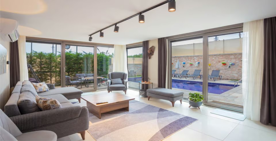 Salon :  Salonda masa ve sandalyeler, LCD TV, uydu alıcı, oturma grubu, ütü ve ütü masası, lavabo, kablosuz modem, lavabo ve tuvalet bulunmaktadır. Salondan havuz kenarına çıkış vardır.