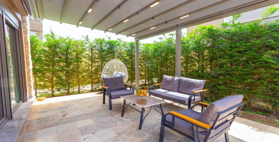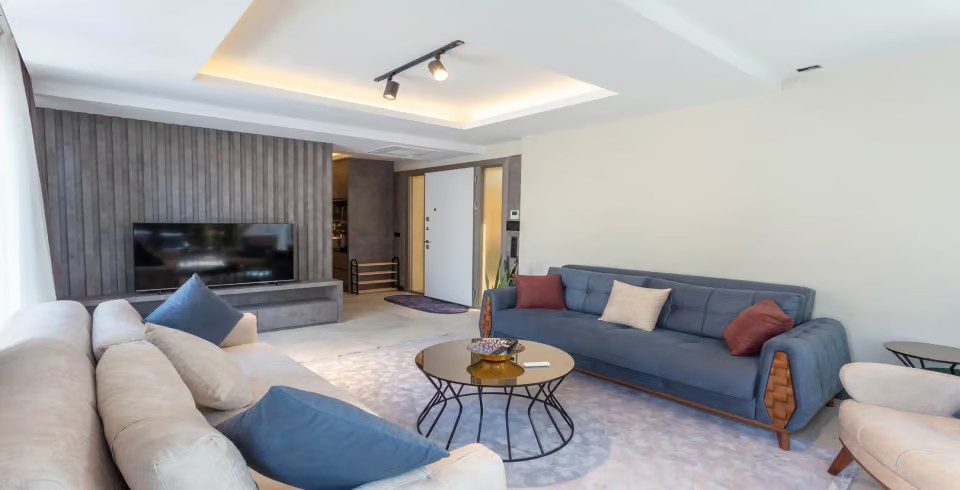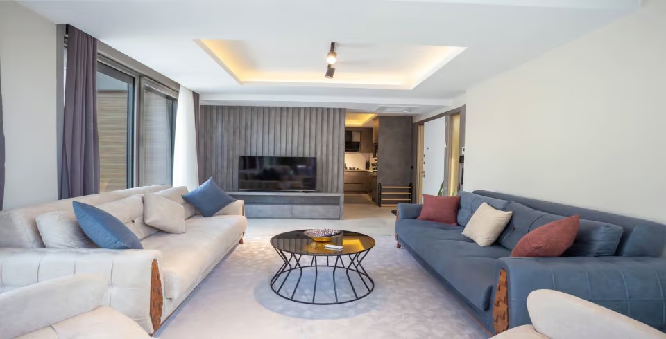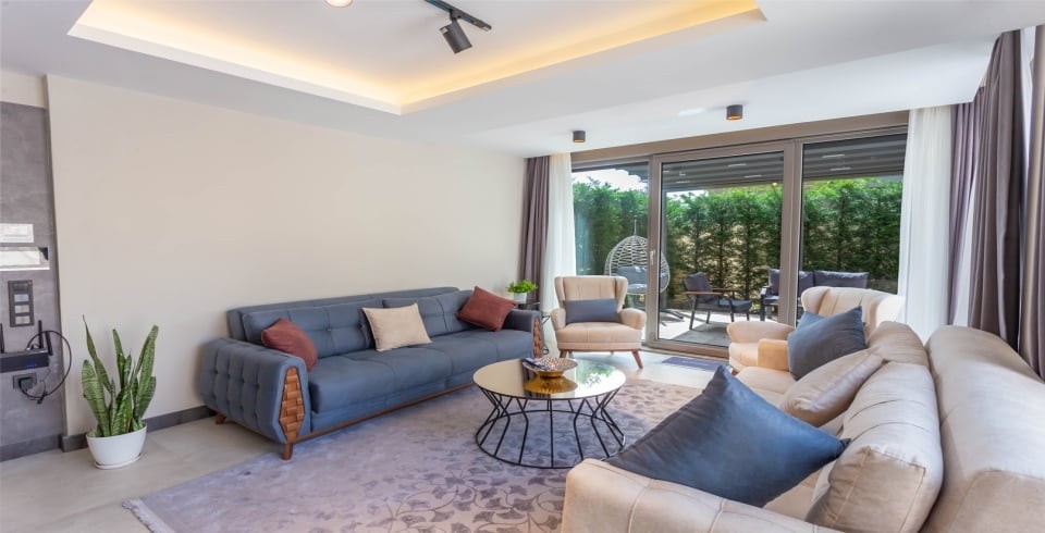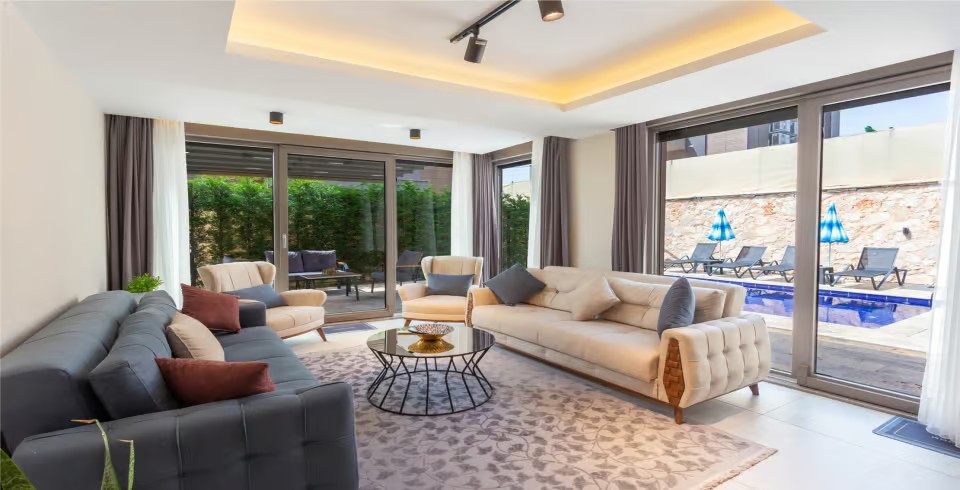 Salon : Villamızın iç dizaynı da son modaya uygun olarak modern bir şekilde tasarlanmıştır. Çeşitli dekoratif eşyalarla süslediğimiz salonumuz havuzlu bahçeye açılıyor. Villa salonunda oturma grubu, TV, internet, klima, sehpa bulunmaktadır.