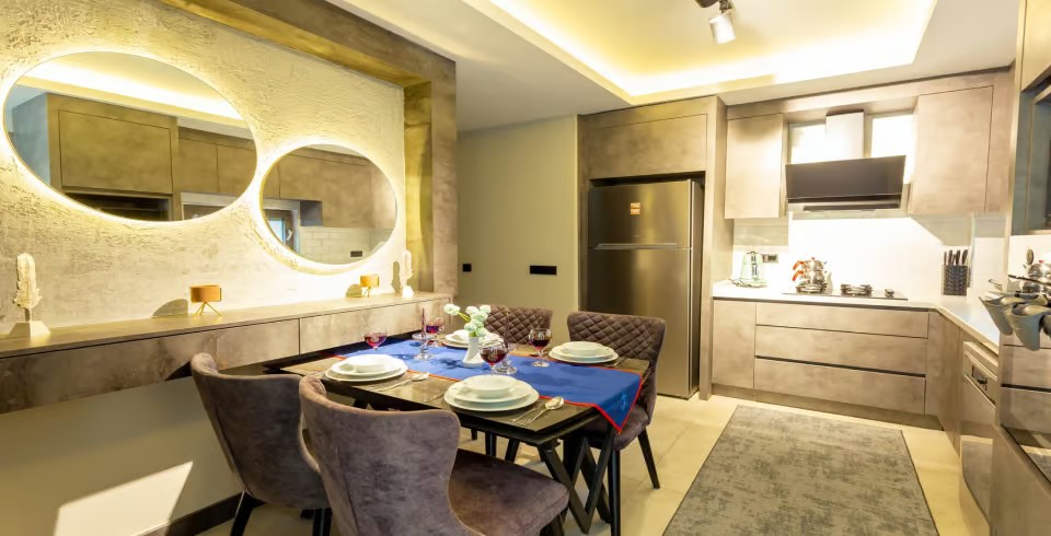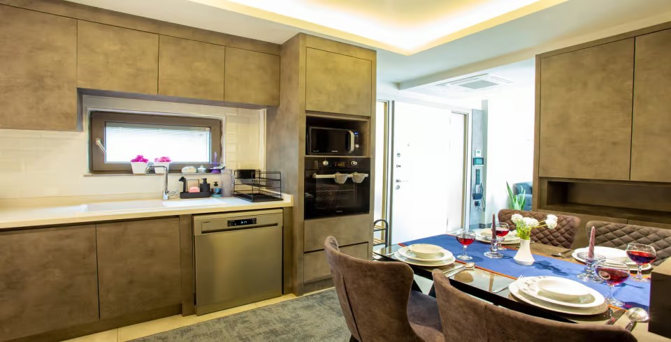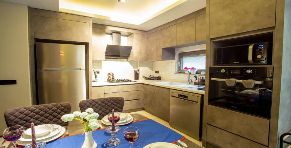 Mutfak : Modern Amerikan Mutfak , buzdolabı , çamaşır makinası , bulaşık makinası , ankastre fırın , mikrodalga fırın , 4 ’ lü ocak , elektrikli su ısıstıcısı , yemek takımı , çatal bıçak seti , tavalar , tencereler , bardaklar bulunmaktadır.