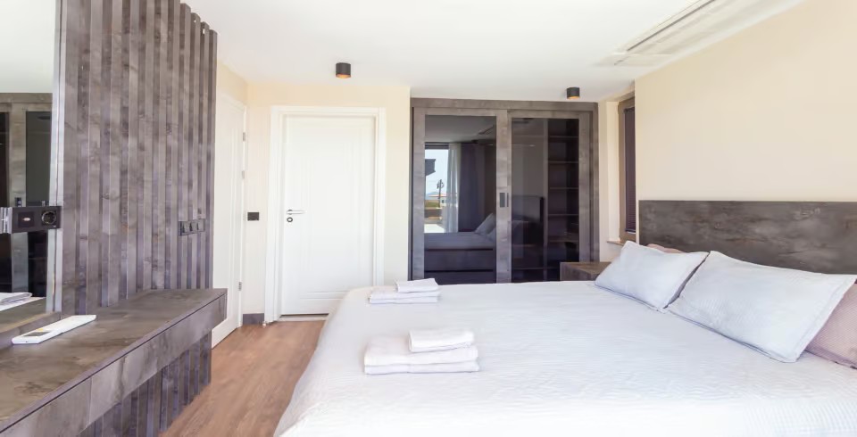 2. Yatak Odası : Klimalı suit aile yatak odası olup,  1 adet çift kişilik yatak , elbise dolabı , makyaj masası , komodin ,  banyo ve tuvalet bulunmaktadır.