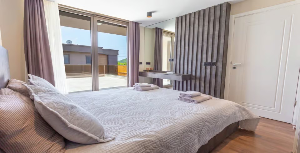 3. Yatak Odası : Klimalı suit aile yatak odası olup,  1 adet çift kişilik yatak , elbise dolabı , makyaj masası , komodin ,  banyo ve tuvalet bulunmaktadır.