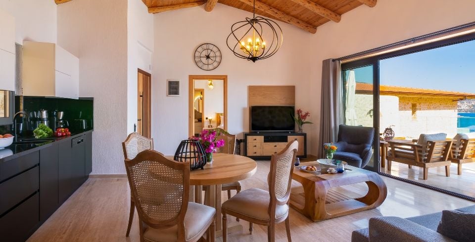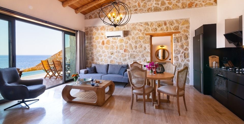 Salon : Salon içerisinde oturma grubu, TV, klima, sehpa bulunmaktadır. Havuz terasına çıkış yapılabilmektedir.