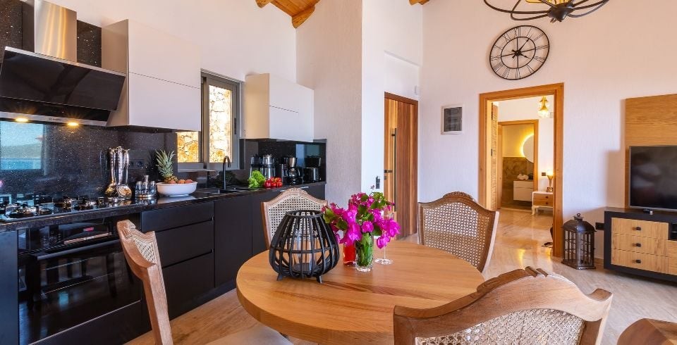 Mutfak : Modern Amerikan mutfak içerisinde buzdolabı, bulaşık makinası, fırın, ocak, mikrodalga fırın, tost makinası, yemek masası, yemek takımları, çatal ve bıçak takımları, tencere ve tava takımları, bardaklar bulunmaktadır.