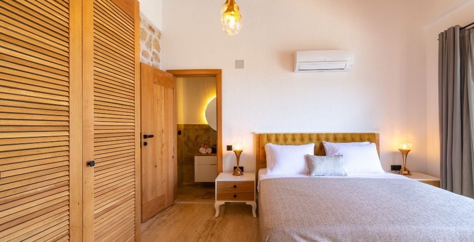 1. Yatak Odası : 1 adet çift kişilik yatak, klima, komodin, elbise dolabı, makyaj masası, yüzme havuzu, banyo ve tuvalet bulunmaktadır.