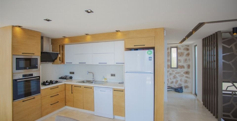 Mutfak : Modern Amerikan mutfak, buzdolabı, bulaşık makinesi, çamaşır makinesi, su sebili, fırın, mikrodalga fırın, 4’lü ocak, elektrikli su ısıtıcısı, 6 kişilik yemek takımı, tava, tencereler, çatal, bıçak vs. bulunmaktadır. .