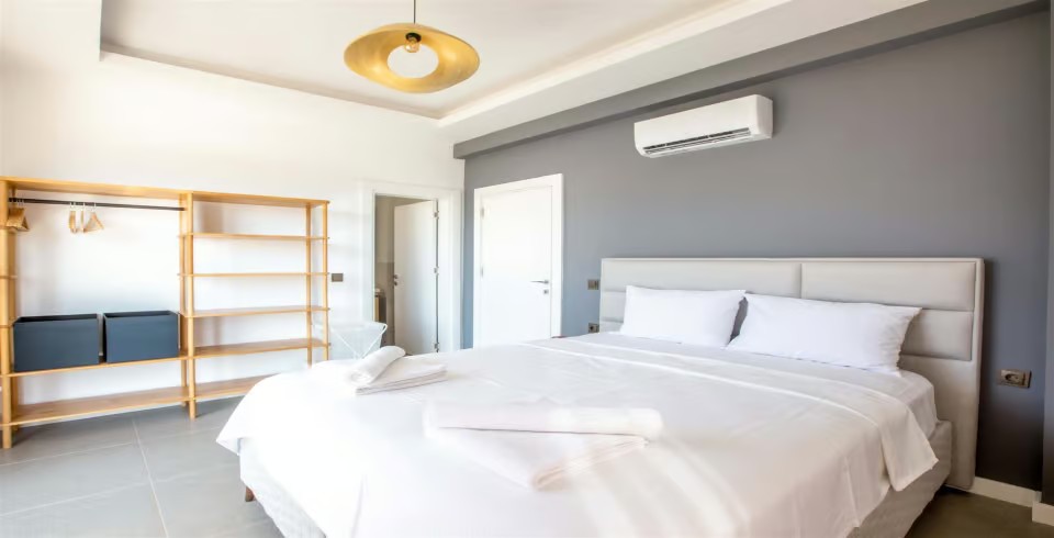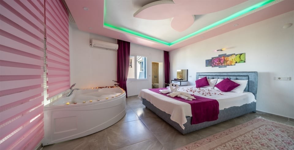 1. Yatak Odası: İki kişilik yatakla beraber sizleri sıcak yaz günlerinde serin tutması için bakımları yapılmış klima ile terası da bulunmaktadır. Elbise dolabı, makyaj masası, komodin, banyo ve lavabodan oluşmaktadır. Bu yatak odamız da jakuzi bulunmaktadır.
