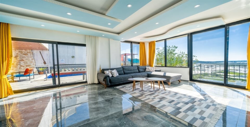 Salon: Villa Yasin’in salonunda sizi şık bir oturma grubu ile şömine, klima, TV, internet, uydu, koltuk, sehpa ile ferah bir salon bekliyor olacaktır. Havuz terasına çıkış yapılmaktadır.