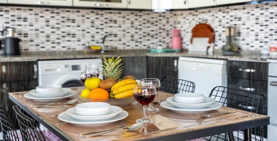 Mutfak: Villamızın geniş Amerikan mutfağı ile sizlere kendi evinizin mutfağı gibi hissettirecek. Ayrıca mutfakta klima, bulaşık makinası, buzdolabı, çamaşır makinası, mikrodalga fırın, tost makinası, ekmek kızartma, su ısıtıcısı, fırın, 4'lü ocak seti ve 4 kişilik geniş yemek masası ile tava tencere vb. mutfak araç gereçlerini kullanma fırsatını sizlere sunuyoruz.