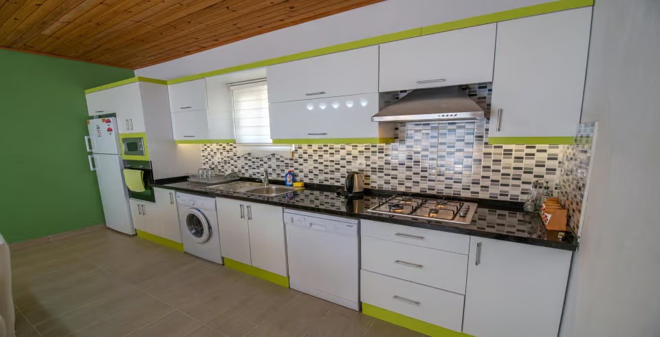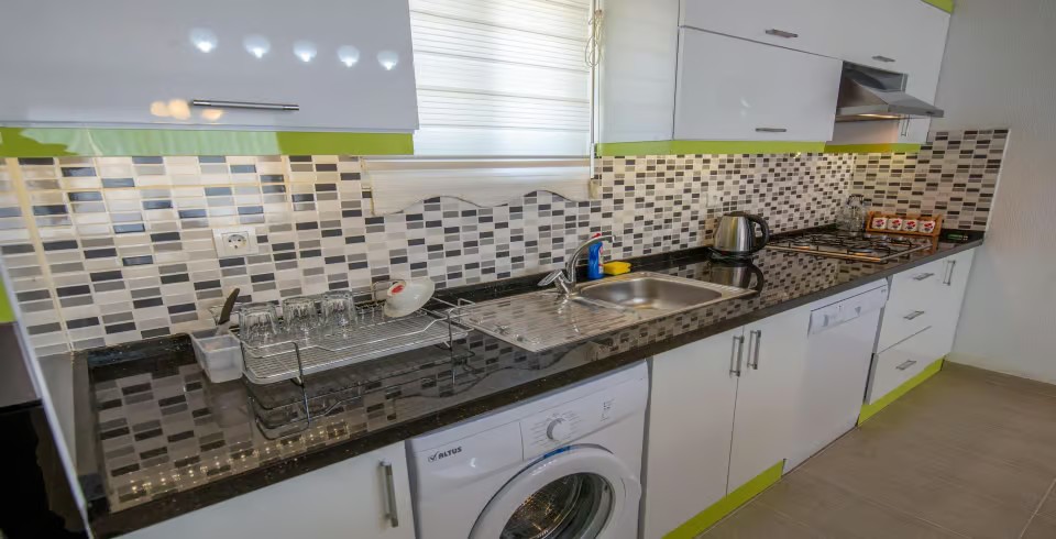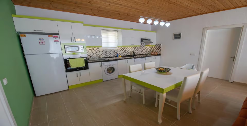 Mutfak: Amerikan mutfak, bulaşık makinası, buzdolabı, ankastre fırın, ankastre 4’lü ocak, su ısıtıcısı, tencere ve tava takımı, yemek takımı, kaşık çatal bıçak takımı, bardak takımı, yemek masası, sandalyeler, tost makinesi, çamaşır makinesi. bulunmaktadır.