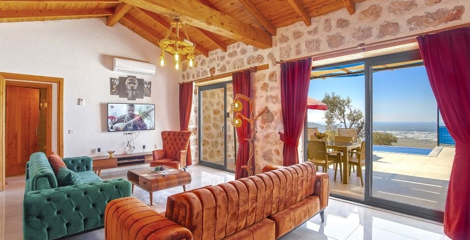 Salon: Salon içerisinde oturma grubu, TV, klima,  sehpa bulunmaktadır. Havuz terasına çıkış yapılabilmektedir.