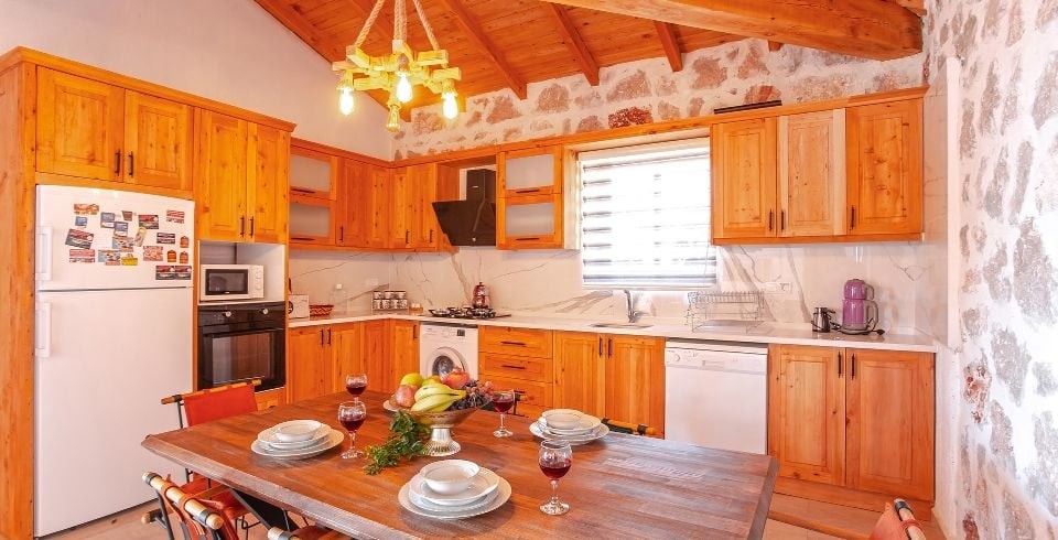 Mutfak: Modern Amerikan mutfak içerisinde 4 kişilik yemek masası, mama sandalyesi, buzdolabı, bulaşık makinası, fırın, ocak, mikrodalga fırın, tost makinası, yemek masası, yemek takımları, çatal ve bıçak takımları, tencere ve tava takımları, bardaklar bulunmaktadır.