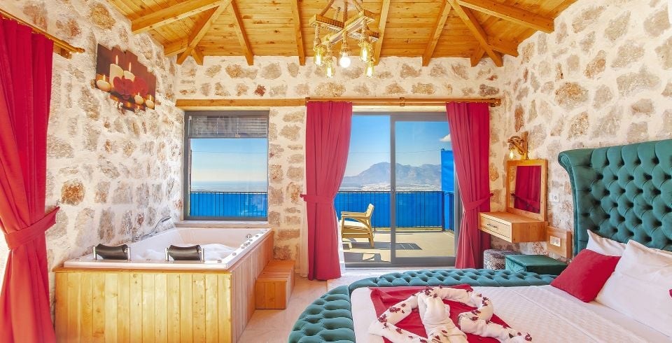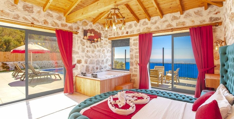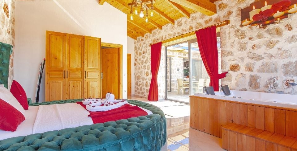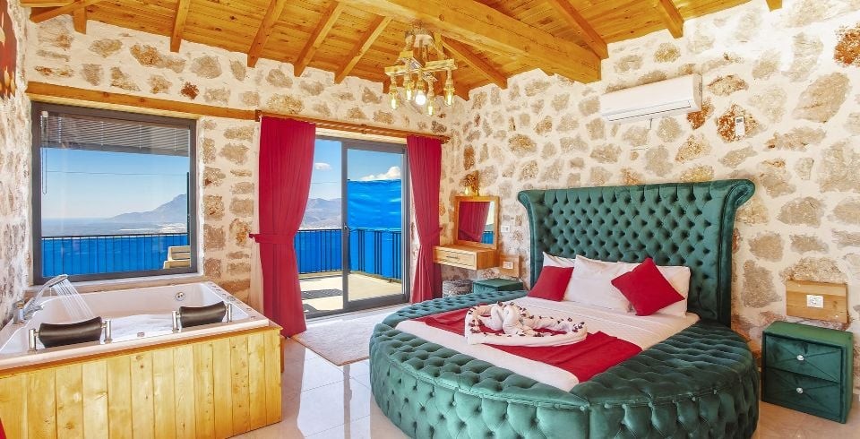 1. Yatak Odası: 1 adet çift kişilik yatak, klima, komodin, TV, elbise dolabı, makyaj masası, jakuzi, banyo ve tuvalet bulunmaktadır.