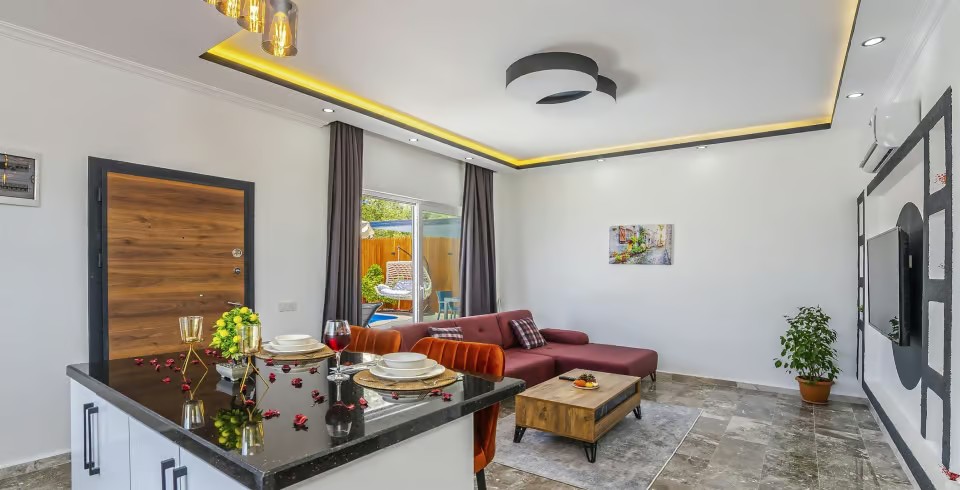 Salon : Salon içerisinde oturma grubu, TV, klima ve sehpa bulunmaktadır. Havuz terasına çıkış yapılabilmektedir.