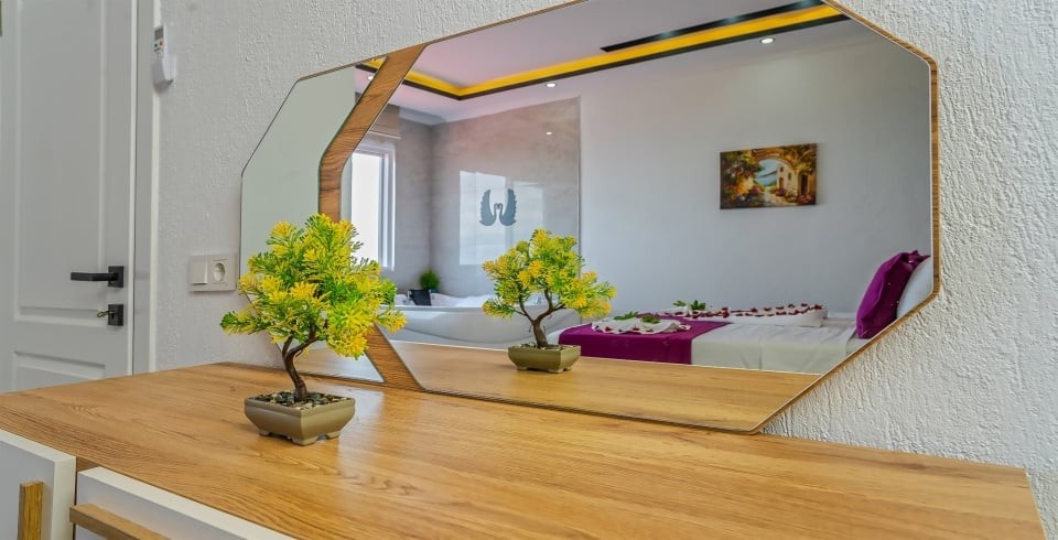 1. Yatak Odası : 1 adet çift kişilik yatak, klima,TV, komodin, elbise dolabı, makyaj masası, jakuzi,sauna, banyo ve tuvalet bulunmaktadır.