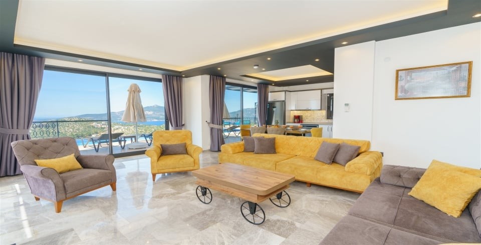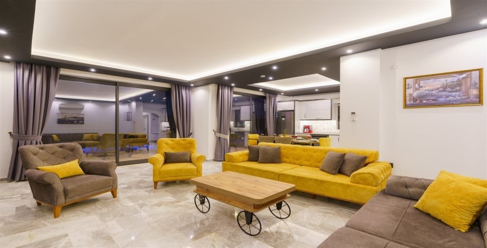 Salon : Salonda klima uydu alıcı, TV, DVD Player, oturma grubu, ütü ve ütü masası, lavabo yer almaktadır ve havuz kenarına çıkış vardır. Salon havuz katındadır. En üst katta dinlenmek ve güneşlenmek için çok geniş bir seyir terası daha vardır. Bu alanda da oturma gurubu, masa ve sandalye bulunur.