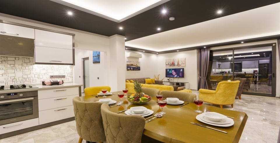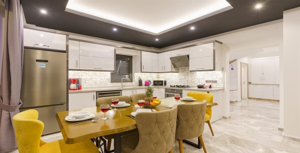 Mutfak :  Amerikan mutfak bulunmaktadır. Mutfakta mikrodalga fırın,  bulaşık makinası, ankastre fırın, buzdolabı, çamaşır makinası, ankastre 4’lü ocak, elektrikli su ısıtıcı kettle, ekmek kızartma makinası, tencere ve tava takımı, 8 kişilik yemek takımı, kaşık ve çatal seti ve bardaklar bulunmaktadır. Mutfak havuz katındadır.
