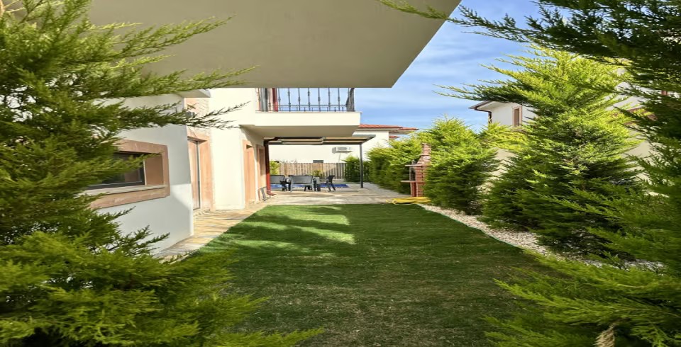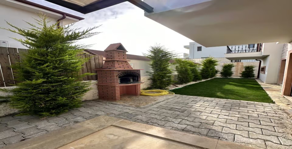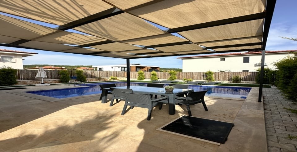 Havuz ve Bahçe : 1.55 santimetre sığ özel yüzme havuzunun içinde şezlong bulunan bahçemizde ekstra şezlonglar, şemsiye, yemek masası, salıncak ve barbekü alanı bulunmaktadır.