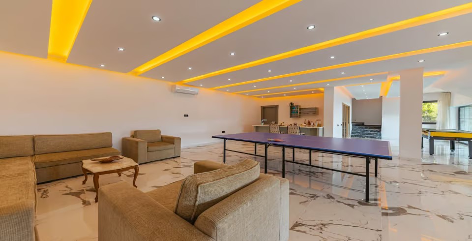Salon: Villamızın salonu içerisinde, koltuk takımı, orta sehpa, TV, TV ünitesi, klima, uydu alıcısı yer almaktadır.