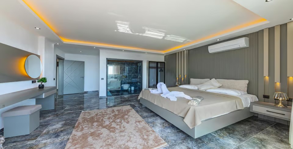 1.Yatak odası: Tatil villamıza ait bu yatak odası içerisinde, 1 adet çift kişilik yatak, klima, elbise dolabı, komodin, makyaj masası,jakuzi, banyo ve tuvalet alanları bulunmaktadır.