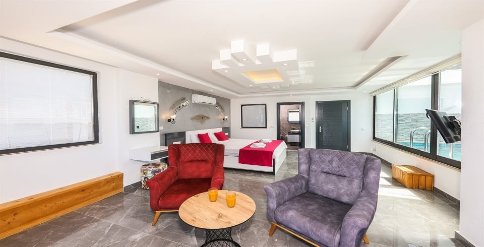 Salon : Salon içerisinde oturma grubu, TV, klima, sehpa bulunmaktadır. Havuz terasına çıkış yapılabilmektedir.